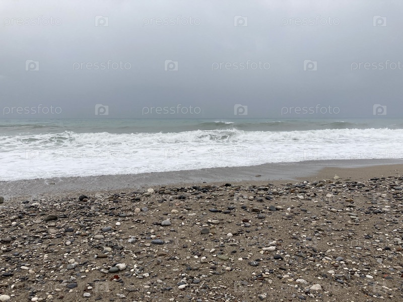 Бурное море штурмует берег из песка вперемешку с галькой