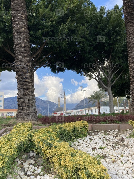 Сквозь деревья и пальмы видна мечеть на фоне гор с низкими пушистыми облаками и голубым небом