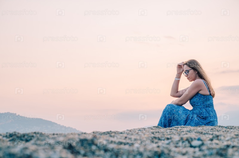 Женщина сидит на пляже и смотрит на море в городе Аланья, Турция. Концепция путешествия или отпуска