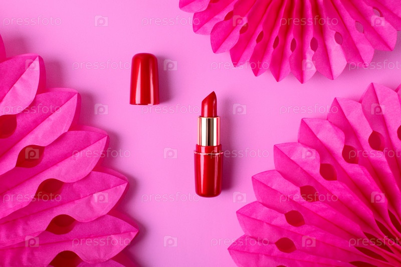 Красная помада на розовом фоне с бумажными веерами. Плоская планировка с косметическим продуктом