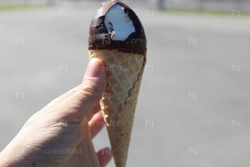 Сливочное мороженое в вафельном рожке в шоколадной глазури крупным планом. Летняя сладость десерта
