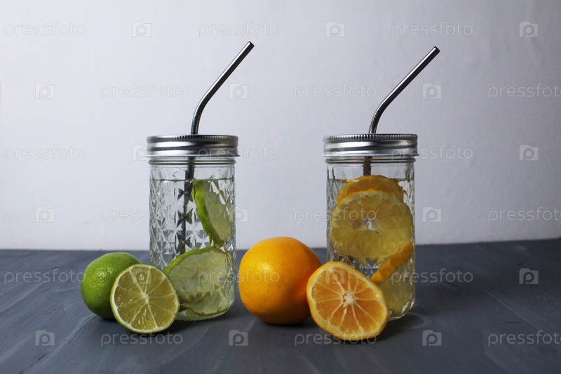 Лимонад из цитрусовых, апельсина и лайма в стаканах с трубкой на сером фоне с местом для текста, летние закуски. Здоровая вода для питья