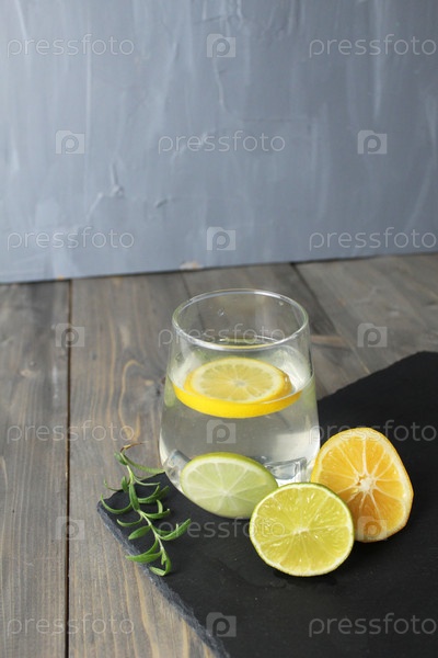 Вода с лимоном домашний лимонад в стакане, рядом лимоны с зеленью розмарина на черной подставке с местом для текста. Здоровая пища напитки напитки