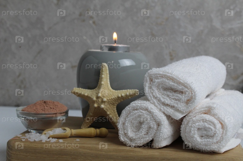 Спа расслабляющий массаж домашний уход за телом. Масло белых полотенец, ароматное для массажа, ароматерапия, свечи, звездное море, лежат на деревянном подносе на сером фоне, вид сбоку