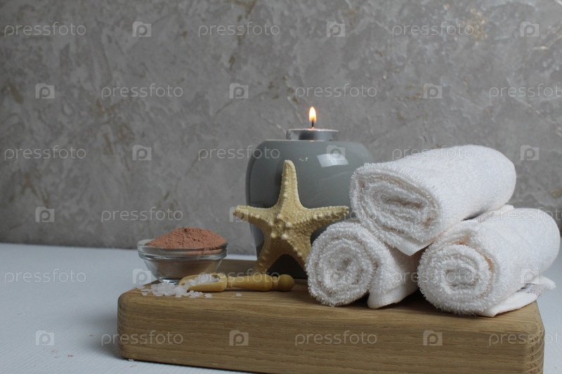Спа расслабляющий массаж домашний уход за телом. Масло белых полотенец, ароматное для массажа, ароматерапия, свечи, звездное море, лежат на деревянном подносе на сером фоне, вид сбоку