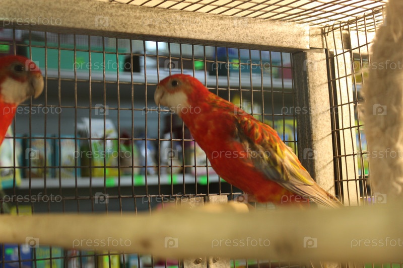 Попугай Розелло желто-красный сидит в клетке на палочке. Птицы в питомнике. Продажа попугаев