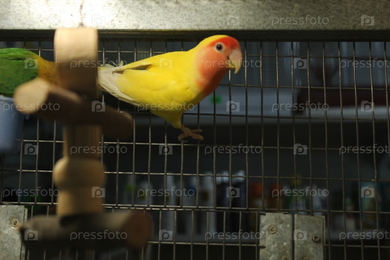 Попугай Розелло желто-красный сидит в клетке на палочке. Птицы в питомнике. Продажа попугаев