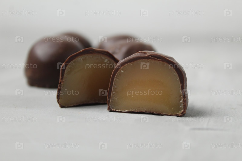 Шоколадные конфеты для тела в огранке со сливочно-пралиновой начинкой на белом светлом фоне. Сладости Шоколадный день