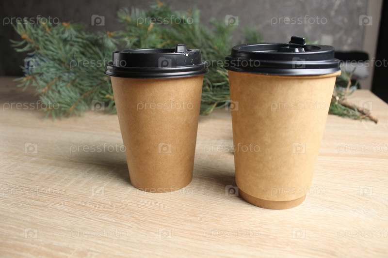 Одноразовая кофейная чашка с крышкой на фоне елки и шапки Санта-Клауса. Новогодние напитки в рождественской атмосфере. Как встретить Новый год вместе