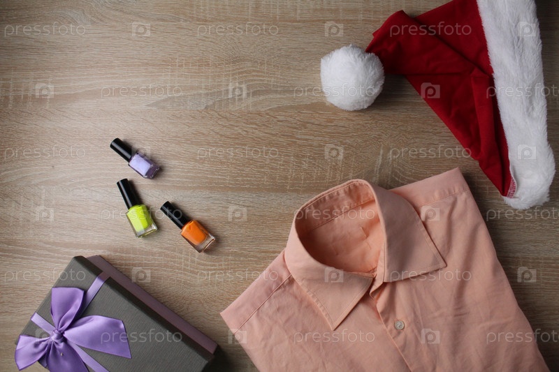 Одежда на рождество новый год. Подготовка к празднику. Подарок саней шляпы рубашки и лаки для ногтей на деревянном фоне. Образ на Рождество