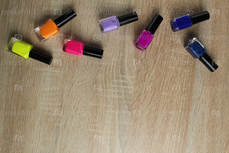 Фоновый лак для ногтей на деревянном фоне розово-желто-синий циреново-оранжевого цвета с черными колпачками. Маникюрный фон с текстовым пространством и копирайтом