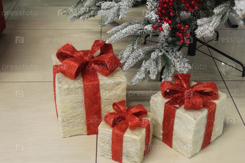 Рождество Новогодняя фотозона с наряженной елкой и подарками, елочными игрушками. праздничная новогодняя атмосфера, подготовка к празднику