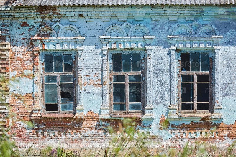 Фасад здания со старыми разбитыми окнами. Три окна с фигурным обрамлением из кирпича