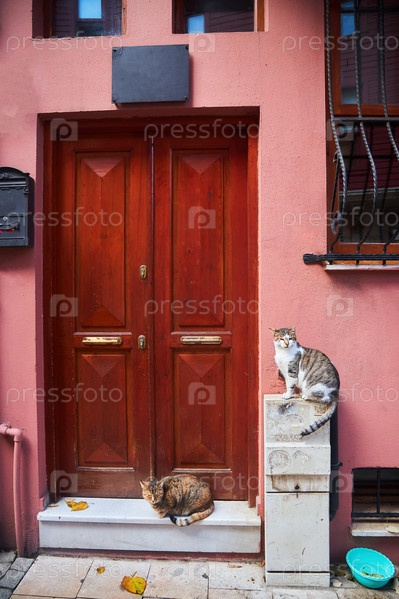 Двери старого многоквартирного дома и кошки. Городская архитектура в Европе