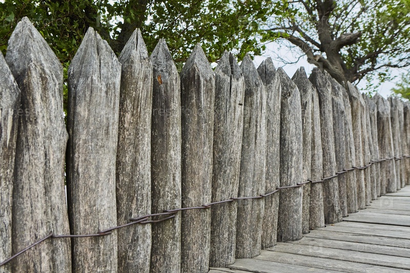Забор и укрепление старинной средневековой крепостной ограды из заостренных деревянных бревен