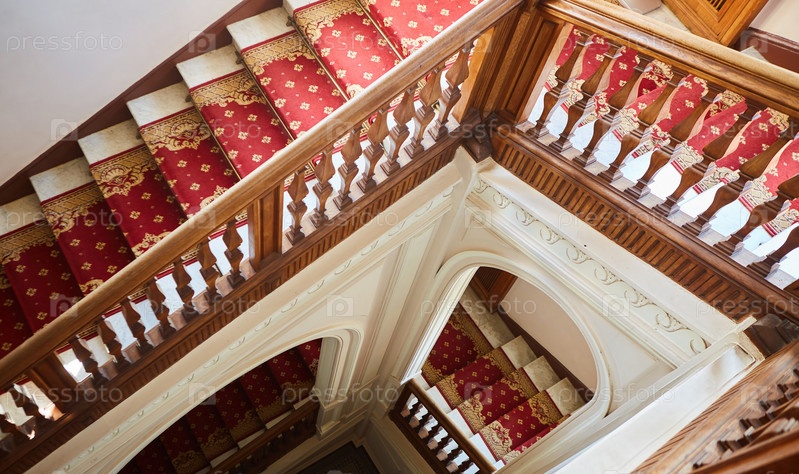 Лестницы в старом доме или дворце. Деревянные перила и ковер на ступеньках