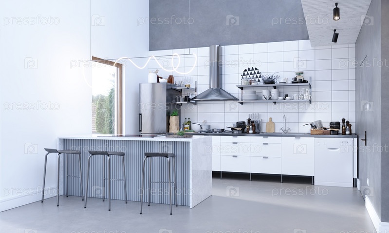 3D иллюстрация черно-белой кухни в скандинавском стиле
