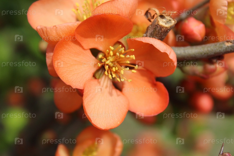 Хеномелес. Маленькие оранжевые цветы на фоне зеленых кустов листьев хеномелеса. Весеннее цветение