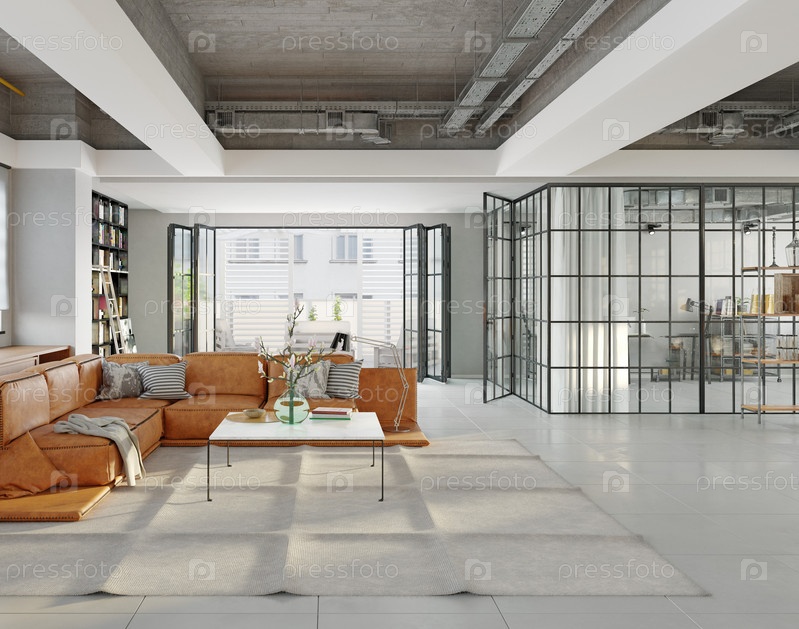 3D-иллюстрация современного интерьера квартиры лофт