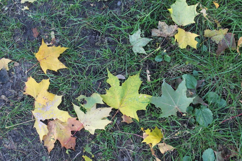 Осенние осенние листья желтые, красные, оранжевые на фоне зеленой травы. Осенний листопад. Опавшие листья, увядание