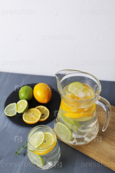 Цитрусовый лимонад в стеклянном кувшине и стакан, лимон, апельсин, лайм лежат на тарелке на сером фоне. Летние закуски, домашний лимонад