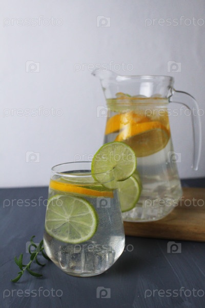 Цитрусовый лимонад в стеклянном кувшине и стакан, лимон, апельсин, лайм лежат на тарелке на сером фоне. Летние закуски, домашний лимонад