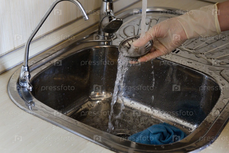 Женщина в резиновых перчатках моет раковину моющим средством. Уборка дома