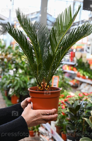 Руки продавщицы держат горшок с пальмой в цветочном магазине. Баннер