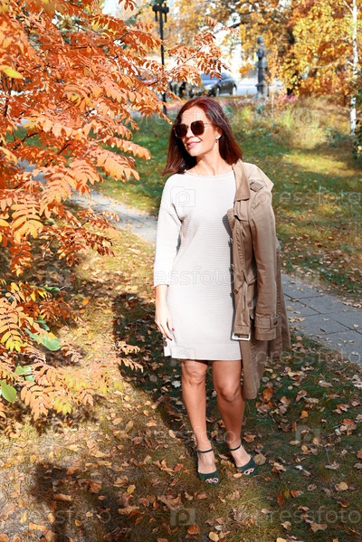 Уверенная в себе молодая стройная женщина в плаще и туфлях на высоких каблуках разговаривает по телефону в осеннем городе, женщина улыбается и наслаждается жизнью