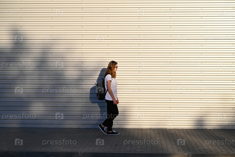 Девочка-подросток в черных брюках и белой футболке идет по улице с черным рюкзаком на спине