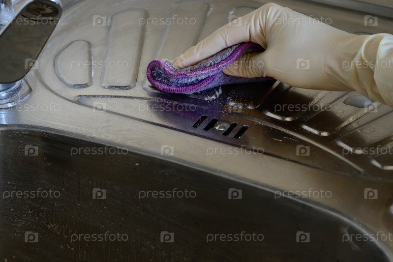 Женщина в резиновых перчатках моет раковину моющим средством. Уборка дома