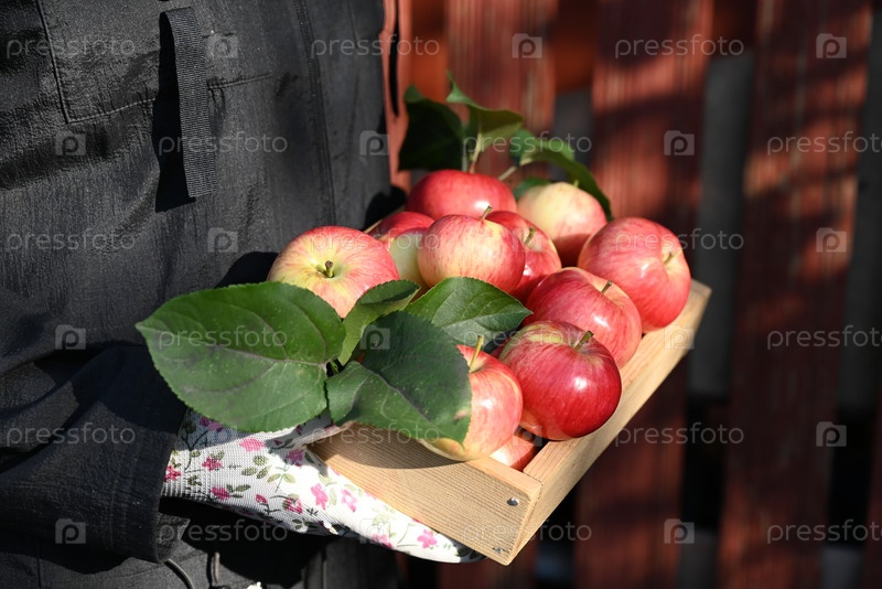 Спелые красные яблоки в ваших руках. Концепция сбора урожая