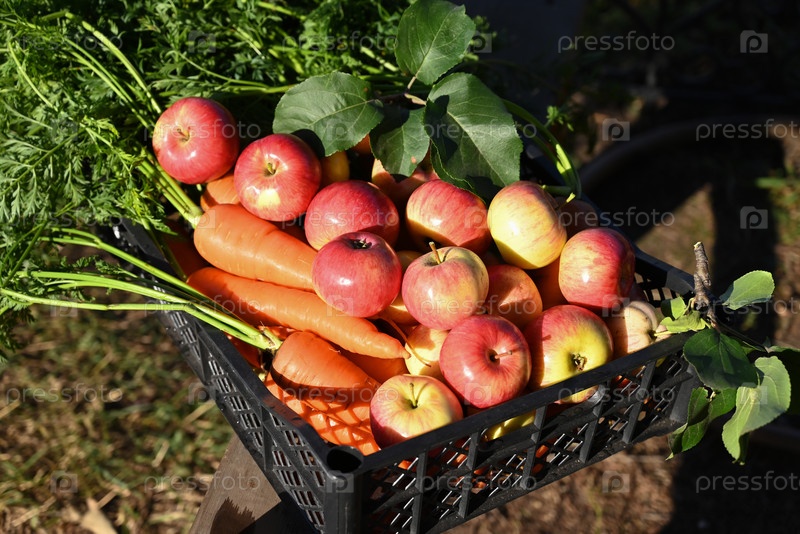Коробка свежих яблок и моркови на деревянном столе в саду