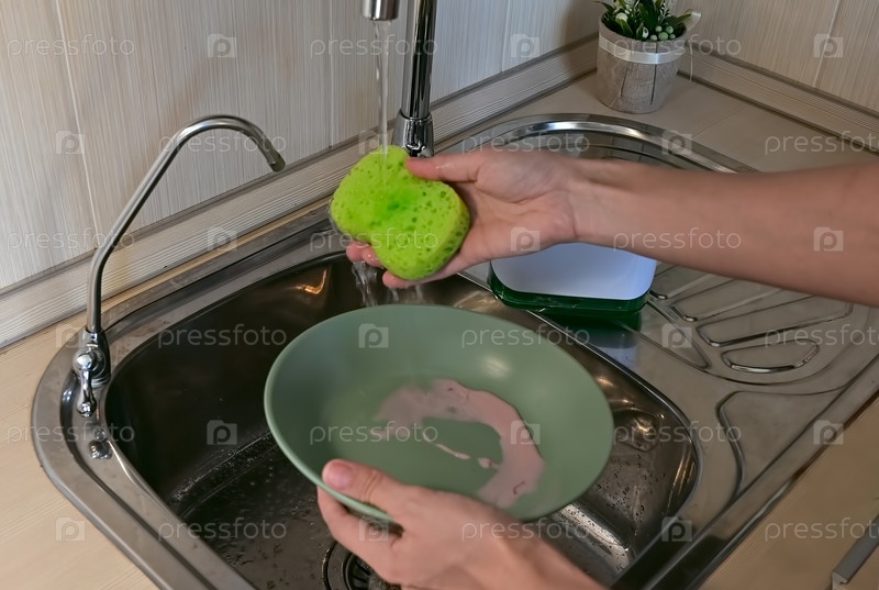 Женщина моет грязную посуду экологически чистым моющим средством и дозатором мыла. Уборка дома