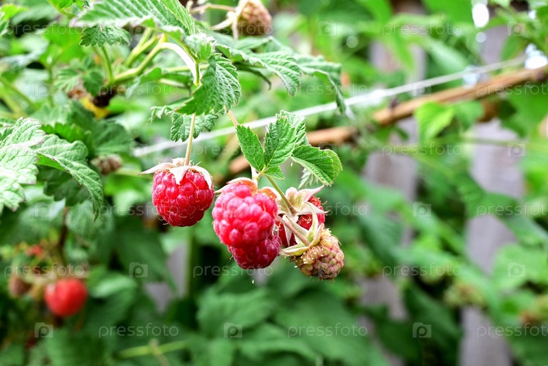 Красная малина в саду крупным планом. Большая ягода спелой малины в саду. Красные сладкие ягоды, растущие на кусте малины в саду