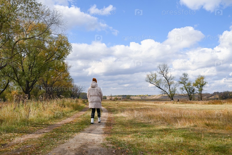 Девушка в легкой куртке и коричневой шляпе смотрит на осенний пейзаж