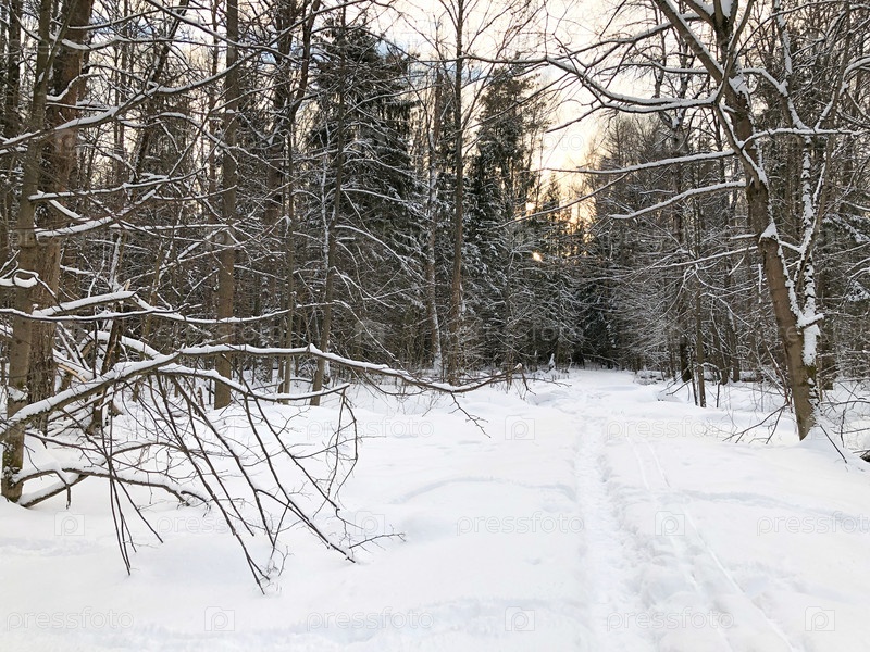 Тонкая тропинка в сугробе в зимнем лесу
