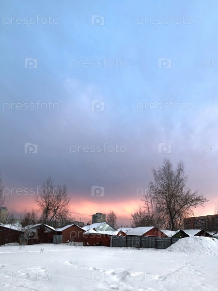 Закатное небо над заснеженными крышами деревенских домов
