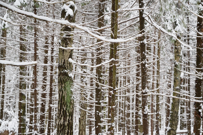 Ряды стволов деревьев с заснеженными ветвями в зимнем лесу