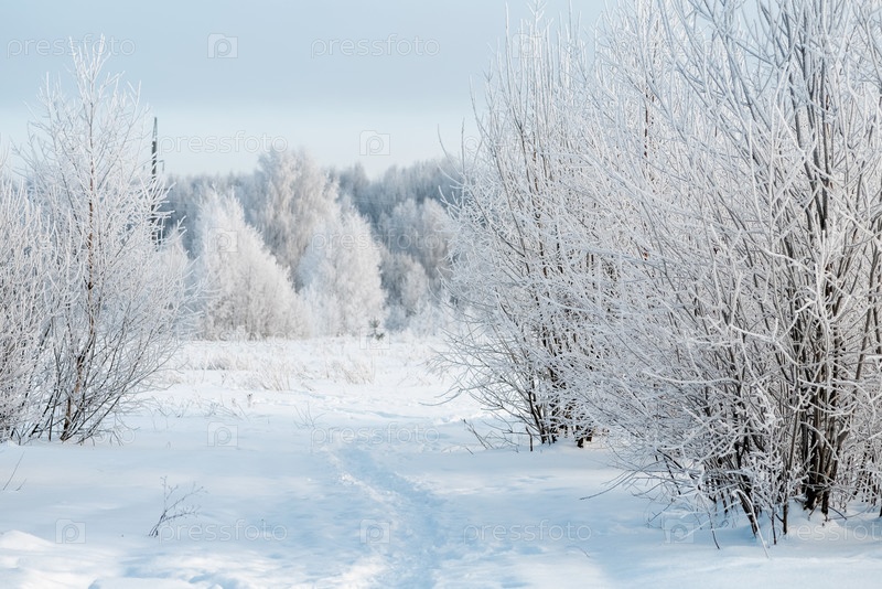 Тропинка в сугробе между кустами, покрытыми белым инеем