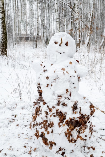 Забавный улыбающийся снеговик, покрытый опавшими сухими листьями в зимнем лесу