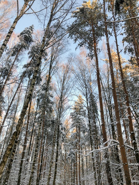 Низкоугольный вид на высокие сосны, покрытые снегом, на фоне голубого неба