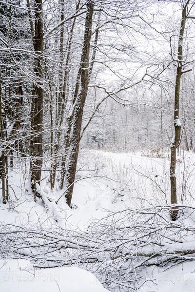 Заснеженные деревья в сугробах в зимнем лесу