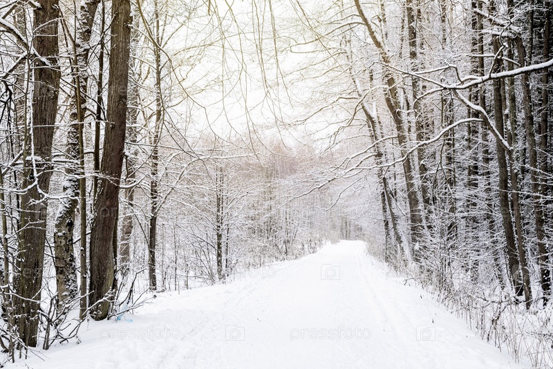 Заснеженная дорога в парке среди голых безлистных деревьев зимний пейзаж