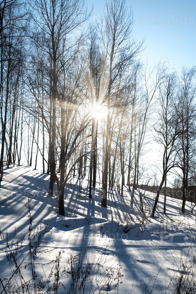 Заснеженный холм, поросший деревьями, сквозь которые сквозь зимний пейзаж пробивается солнечный свет. Длинные темные тени, отбрасываемые деревьями на снег