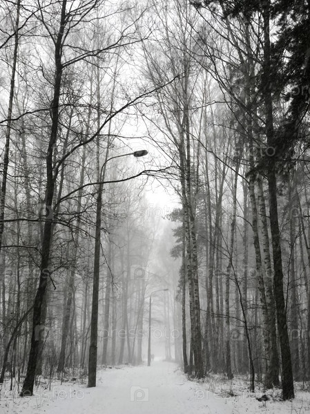 Сильный снегопад скрывает дорогу в зимнем парке