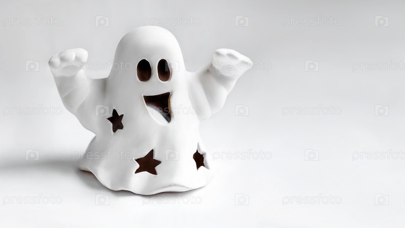Забавный белый призрак делает бу-жест на белом фоне. Открытка на Хэллоуин