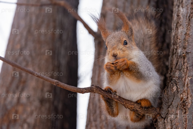 Милая белка ест орех, сидя на дереве в зимнем парке