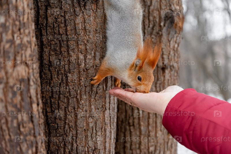 Белка берет орех из протянутой руки