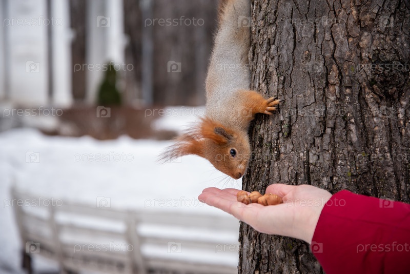 Белка берет орех из протянутой руки
